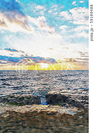 朝水彩風の砂浜と海の背景イラスト イラスト素材 フォトライブラリー Photolibrary